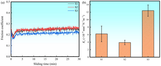 where r and A are the radius and area of wear tracks, respectively, and F and S are the load and sliding distance, respectively. The friction coefficient curves of the three samples experienced a short fluctuation within an unstable period (about 3 min) and then became more stable. The average friction coefficients of S1, S2, and S3 were calculated during the steady period (3-30 min). S1 exhibited both a high friction coefficient (0.25 ± 0.01) and a high Kc (6.2 ± 2.1 × 10−4 mm3·N−1m−1). A similar friction coefficient (0.25 ± 0.01), but the lowest Kc (3.9 ± 0.6 × 10−4 mm3·N−1m−1) was obtained for S2. Interestingly, S3 exhibited the lowest friction coefficient (0.22 ± 0.01) but the highest Kc (12.4 ± 1.5 mm3·N−1m−1).