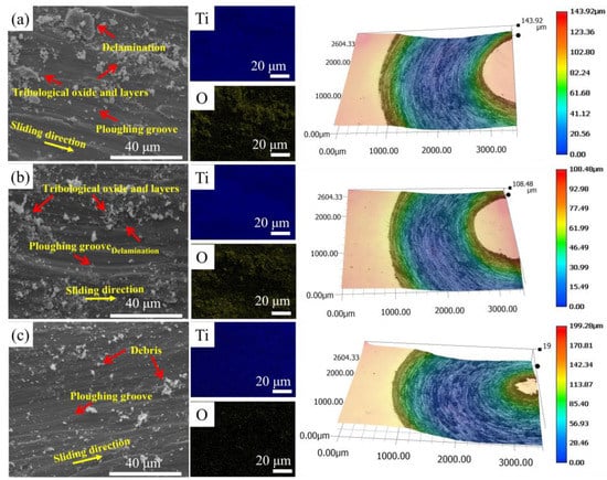 The worn surfaces (typical morphologies and 3D surface profiles) and corresponding EDS mapping of S1, S2, and S3 are presented in Figure 12. The shallower grooves along the sliding distance on S1 and S2 surfaces were clear while the severer grooved scratches and more debris can be observed on the S3 surface. Based on the EDS mapping result, it was demonstrated that wear debris were tribological oxides and the tribological layers were composed of oxides. In addition, white debris detected in Figure 12 were considered an oxidative wear character because of the exposure to the air during the dry sliding wear test [,].