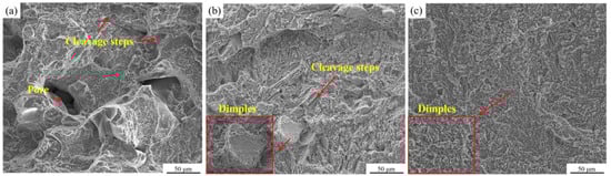 Secondary electron images of the fracture surfaces of the LPBF-ed Ti + B4C composites are shown in Figure 13. There were several pores and cleavage steps evident in S1 caused by insufficient VED (Figure 13a). During tensile testing, crack propagation may begin at such defects, leading to worse ductile performance [,]. Such pores were not evident for S2 and S3, which explained the higher ductility for these two specimens. A combination of cleavage steps and dimples can be observed in Figure 13b, which demonstrated that the fracture mechanism was a mixture of brittle fracture and plastic deformation. However, the dimples were small and shallow, compared with that in Figure 13c. This phenomenon explained the plastic deformation in S2 was limited. The main fracture mechanism of S3 was plastic deformation because of the full dimples. In summary, the mechanism of fracture changed from brittleness to ductile failure with the enhanced VED.