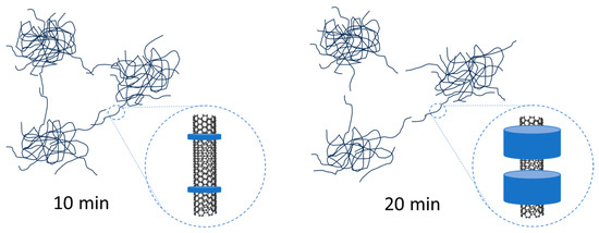 Nevertheless, the maximum of the melting peak of the nanocomposites produced by the longer melt processing time (i.e., 20 min) is higher than that of the nanocomposites obtained by the shorter melt processing time (i.e., 10 min). This suggests that the crystals of the nanocomposites processed for 20 min are thicker than those of the nanocomposites processed for 10 min. Moreover, from the second heating scan by DSC, we observe that the melting peak shifted to a slightly higher temperature, suggesting the formation of even thicker crystal lamellae. These results are in agreement with what we showed in a previous study on very similar nanocomposites for which we studied their morphology in detail, notably by TEM analysis [32]. In particular, we demonstrated that HDPE crystallites developed during the shear melt-mixing on the CNT surface in the form of a structure known as a Shish-Kebab. This type of structure is well documented in scientific literature [31,32,34]. It can be explained by the fact that CNTs are very good nucleating agents for HDPE crystallization [32,33,34]. We also showed that the longer the shear mixing time in the melt, the larger the HDPE crystallites became. Moreover, we observed that increasing the mixing time from 10 to 20 min did not drastically modify the overall dispersion state of the CNTs in the HDPE matrix, nor did it damage the length of the CNTs (i.e., no significant cut-off CNTs during processing). To better visualize these phenomena, we have schematically represented the morphologies achieved at 10 min and 20 min, respectively, in Figure 2.