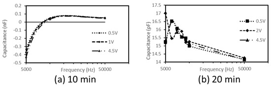 Frequency-dependence of the capacitance of HDPE/4.6%CNT nanocomposites as prepared by melt blending with processing times of (a) 10 min and (b) 20 min.