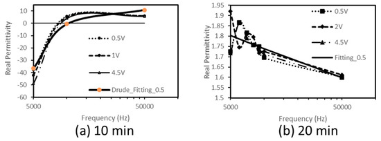 As observed, the real permittivity of the nanocomposite produced by the shorter processing time (10 min) (Figure 4a) displays positive values almost frequency-independent towards higher frequencies and negative values decreasing towards lower frequencies. This behaviour can be, theoretically, described by the Drude model [38], which gives frequency-dependent real permittivity as follows: