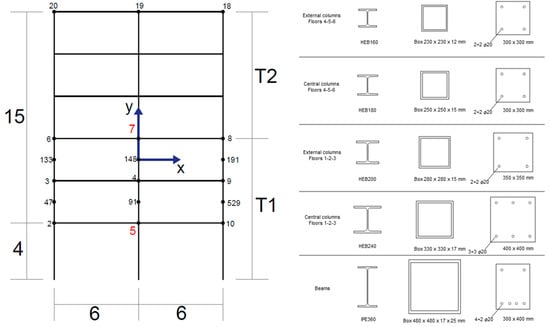 Table 7 and Table 8 report the beam and column cross-sections with respective reinforcement (reported in terms of the diameter of the steel bars , in mm). The geometrical equivalent cross-sections for every element of the frame are illustrated on the right side of the previously reported Figure 2. Square cross-sections are considered for the columns, while the aforementioned cm rectangular cross-section is used for all beams.