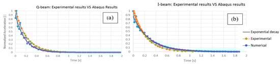 The Q-beam and I-beam experimental results reported by Russo and Boscato [6] are reported in Figure 3, alongside the FE analysis results. These highlight the strong similarities between the experimental data and the numerical simulations. Figure 3b shows the I-beam’s free vibration response. The interpolation line of the acceleration peaks decreases with exponential law as time increases due to the damping effect of the material. The acceleration values before 0.1 s are disregarded because of the impact load interference in the first part of the simulation which causes a disturbance to the acceleration recording. As can be seen, the two curves match quite well, with a maximum difference of 15.5% (due to the aforementioned reasons) considering the whole time series. The maximum difference is reduced to 5.3% if the part before 0.1 s is omitted, as said, with this maximum divergence happening in the central part of the curves at 0.43 s. The overall response of the analysed I-beam under free vibration can be considered practically the same for both the numerical simulation and experimental analysis. A comparison between the numerical analysis and experimental results for the box Q-beam is shown in Figure 3a. Again, the maximum value occurs at the initial instant (t = 0.00 s) and then the acceleration fades away according to an exponential law. The two curves show a similar behaviour at any time, with a maximum difference of 12.1% at 0.06 s.