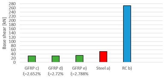A time-history analysis is performed under the hypothesis of large displacements. Base shear is evaluated as the horizontal reaction force at the bottom of the three ground-floor columns. The maximum base shear values for all frames are reported in Table 13 and plotted in Figure 4. As one can see, the value is much higher for RC. This is understandable as the base shear is mostly dependent on the mass of the structure. In this case, the total weight of the frame was 6046.36 kg for the GFRP one; 7396.20 kg for the steel one; and 39,390.75 kg for the RC one. It is evident that the latter frame has a considerably higher mass and subsequently higher base shear, while the GFRP is the most lightweight option; the minimum value, which corresponds to the lowest damping ratio ξ = 2.652%, is highlighted in bold.