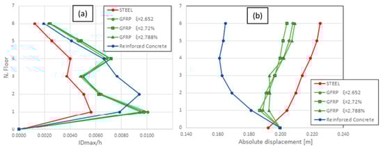 The seismic structural response can also be assessed in terms of absolute displacement, which is the horizontal displacement of a specific node from its original equilibrium position. The evaluation of the maximum absolute displacement for each floor provides a general idea of the overall structural deformability. The highest value of lateral displacement during the earthquake is exhibited by the steel frame: as shown in Figure 5b, the maximum value of 0.225 m occurs in correspondence with the top floor, and displacements decrease at lower floors. The RC frame exhibits an opposite trend, with maximum values at the bottom, except for the last two floors that follow the steel trend. The GFRP frames, which show almost coincident trends, have a more uniform displacement distribution along the structure’s height, containing displacements between 0.18 and 0.21 m. In general, it can be observed that the GFRP frames, as far as absolute displacements are concerned, have an intermediate behaviour between the two more traditional materials with a general trend more similar to steel than to RC.
