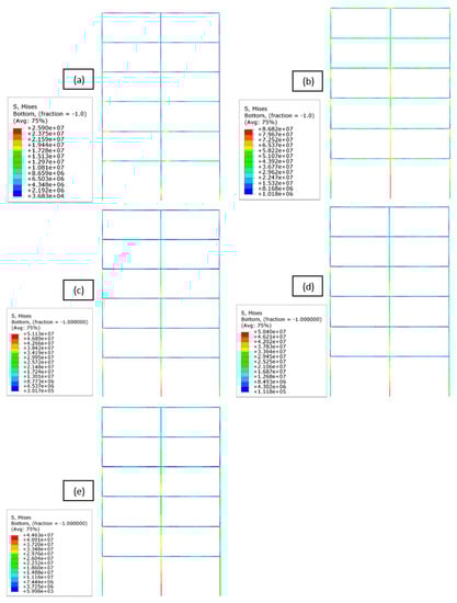 Stress contours at 15 s for the different frames: reinforced concrete (a), steel (b), GFRP with ξ = 2.652% (c), GFRP with ξ = 2.720% (d), and GFRP ξ = 2.788% (e).