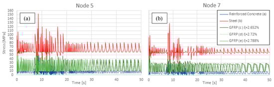 Node 5 is the one subjected to the highest stress in the GFRP frames as well (67.77 MPa for ξ = 2.652%). This value does not decrease considerably on the upper floors, remaining between 50 MPa and 60 MPa until the third floor and then strongly decreasing until a minimum of less than 20 MPa is reached at the top floor. All three GFRP frames are characterised by a homogeneous stress distribution over the entire earthquake duration, with average values between 10 MPa and 40 MPa for node 5, Figure 7a, and between 10 MPa and 30 MPa for node 7, Figure 7b, without significant peaks. Therefore, the whole frame is verified at any node and at all times, even considering the lowest point in the range of the material longitudinal tensile strength (200 MPa).
