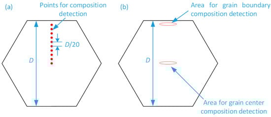 Schematic of composition detection areas (a) Micro-areas chosen in one grain for composition detection, (b) Composition detection areas in grain center and near grain boundary.