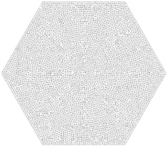 The mathematical forms of the unsteady diffusion mass transfer and unsteady heat conduction equations are similar. Therefore, the heat transfer module in the finite element software ProCAST can be used for the numerical simulation of Fe diffusion during the Ti-1023 homogenization HT process. A two-dimensional geometric model of a single grain of Ti-1023 was established, assuming the grain to be hexagonal with a side length of 4 mm. The finite element mesh of the grain consisted of 10,704 nodes and 9142 triangular elements, which were selected based on several mesh refinements, as shown in Figure 4.