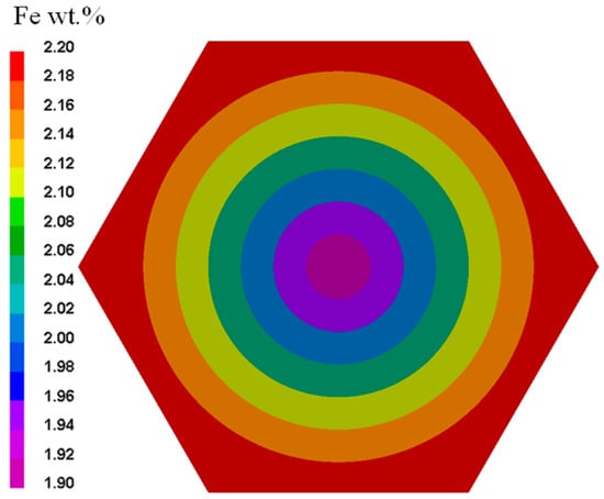 The initial distribution of Fe contents is shown in Figure 5. The Fe contents in the grain center and grain boundary are set according to the results of detection of Fe element content distribution in sample grains, which are about 1.9% and 2.2%, respectively. The boundary edges of the single grain are considered walls, meaning that no Fe atoms moving in or out of the single grain through these six edges.