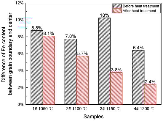 Then, the 1#–4# Ti-1023 samples were subjected to homogenization HT at different temperatures of 1050 °C, 1100 °C, 1150 °C and 1200 °C for 12 h, respectively. During the homogenization HT process, Fe atoms are capable of diffusing against the concentration gradient, reducing the chemical segregation to a certain extent [34,35]. The results show that after homogenization HT at 1050 °C for 12 h, the Fe content deviations in the Ti-1023 ingot are 5.7%, 12.8% and 5.6%, respectively, which are not significantly lower than before HT. These results indicate that at 1050 °C, the diffusivity of the Fe element is lower, and the diffusion rate is lower, resulting in an insignificant homogenization effect of the Fe content after 12 h. When the homogenization HT temperature is increased to 1100 °C, the Fe content deviations in the ingot are 3.4%, 4.6% and 9.3%, respectively, which are slightly improved compared to before HT. This indicates that significant homogenization and diffusion of the Fe element cannot be achieved within 12 h under 1100 °C. When the homogenization HT temperature is increased to 1150 °C, the Fe content deviations in the ingot are 2.6%, 3.8% and 5.0%, respectively. The uniformity of the Fe content distribution in the grains is improved to a certain extent compared to before HT. After 12 h of homogenization HT at 1200 °C, the Fe content deviations in the ingot reaches 0.4–3.8%, and the distribution uniformity of the Fe content is further improved with the increase in temperature, as shown in Figure 8.