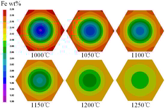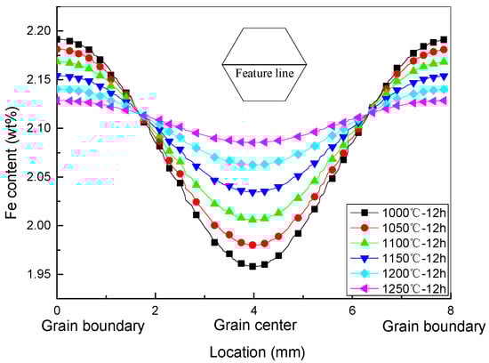 Both HT temperature and time have significant effect on the homogenization of alloys [39,40]. Increased homogenization treatment temperature and extended holding time can significantly alleviate the segregation of the alloying element [41]. In other words, a reasonable high HT temperature and long HT time will result in a uniform distribution of alloy elements. The distributions of Fe content in Ti-1023 grains after homogenization HT for 12 h at different temperatures are shown in Figure 9, it can be seen that: (1) For a single grain, the higher the homogenization HT temperature, the more uniform the distribution of Fe element content would be after a certain HT time. (2) Homogenization HT temperature has a great influence on the homogenization of Fe content in a single grain. For example, after homogenization HT at 1000 °C and 1250 °C for 12 h, the differences in Fe contents between the grain center and grain boundary are 0.21% and 0.04%, respectively, and the Fe content deviations are 10.9% and 1.8%, respectively.