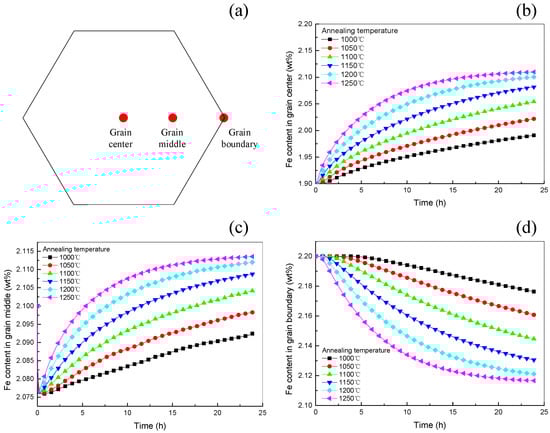 Three characteristic points were selected within the grain of Ti-1023: the core, the middle and the grain boundary, as shown in Figure 11a. The Fe contents of these three characteristic points at different homogenization HT temperatures with time are shown in Figure 11b–d. It can be seen that: (1) The Fe content in the core and middle of the grain increases with increasing homogenization HT time. The higher the homogenization HT temperature, the faster the initial increase in Fe element content, and the slower the subsequent increase at the end of the HT. (2) The Fe content at the grain boundaries decreases with increasing homogenization HT time. During homogenization HT, the high temperature accelerates the diffusion rate of atoms, making the dendritic segregation gradually disappear [42]. The higher the homogenization HT temperature, the faster the initial decrease in Fe content, and the slower the subsequent decrease at the end of the HT.