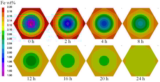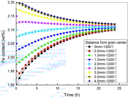 At a reasonable homogenization temperature, the alloy elements gradually tend to distribute uniformly with an increase in homogenization time [42]. Distributions of Fe content in the grain during homogenization HT of Ti-1023 were obtained at different temperatures of 1000 °C, 1050 °C, 1100 °C, 1150 °C, 1200 °C and 1250 °C, respectively. Figure 12 shows distributions of Fe content in the grain during homogenization HT of Ti-1023 at a temperature of 1200 °C. During homogenization HT of Ti-1023, the Fe content in the grain tends to become more uniform gradually with an increase in time. When the HT time is 24 h at 1200 °C, the Fe content in the Ti-1023 grains can reach a nearly complete uniformity.