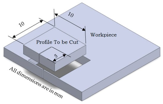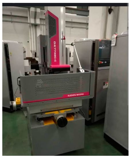 In this work, a CNC wire-cut EDM DK7732C-C manufactured by Suzhou Baoma Numerical Control Equipment Co., Ltd. (Suzhou and China) with 3 kVA power and a BMW 3000 controller (Figure 1) was used to cut the profile shown in Figure 2 on a commercial titanium Ti6Al4V alloy of 5 mm thickness. Table 1 presents a list of the chemical components of the titanium Ti6Al4V alloy utilized in this investigation. Deionized water was utilized to eject the waste particles produced during the machining process, and a Ф 0.25 mm zinc-coated brass wire was utilized as the electrode for cutting purposes.