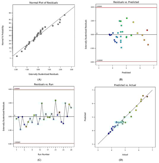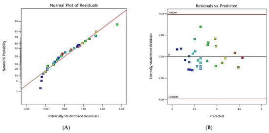 The data statistics are shown in Figure 3 and Figure 4; analyzing the experimental and the model observation diagnostic plots enabled the determination of the models’ accuracy. Figure 3A and Figure 4A show the residual plots for the responses, which exhibited a normal% probability distribution, whereby the points were logically closer to the straight line, with no significant deviations; thus, the current model significantly improved the interaction between the response and the process variables.