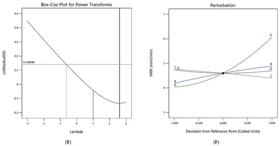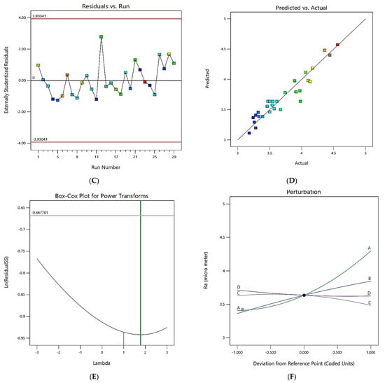 Diagnostic graphs for the Box–Behnken model for MRR: (A) Normal plot of residuals; (B) residuals (versus) predicted; (C) Residuals (versus) run; (D) Predicted (versus) actual; (E) Box–Cox plot—power transformations; (F) Perturbation. Letters A, B, C and D are the process (variable) parameters. The colored squares represent the residual of each run.