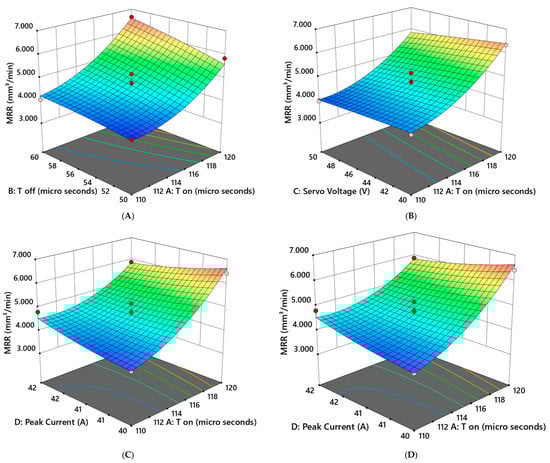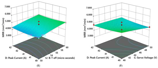 Figure 5 illustrates the 3D response surface plot for the MRR, from which it can be observed that the maximum MRR (6.62 mm3/min) was recorded for maximum Ton (120 µs) and Toff (60 µs) but medium voltage (45 V) and current (41 A). When the titanium (Ti6Al4V) alloy was processed using WEDM, the combined effects of Ton with Toff, Ton with current, and Ton with servo voltage (Figure 5A–C) resulted in better spark creation and improved characteristics, which increased workpiece vaporization and melting, thereby resulting in increased MRR. Therefore, the combination of higher values for these input parameters resulted in an increase in the EDM process’s overall productivity. In the case of the interactions of Toff with current and Toff with voltage (Figure 5D,E), it is evident that there was little variation in these two factors, along with a gradual increase in MRR. The interaction of current and voltage (Figure 5F) had a negligible impact on the WEDM productivity.