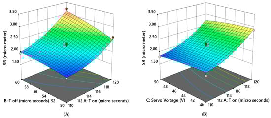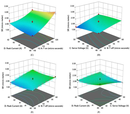 From the 3D response surface plot of SR (Figure 6), it can be observed that the surface roughness was minimum (3.18 µm) for maximum voltage (50 V), minimum Toff (50 µs), and medium Ton (115 µs) and current (41 A). In general, it can be observed that interactions among the various machining parameters were much simpler than the simple rule of thumb, and their combined impact on the process response was quite ambiguous. Figure 6A–C show how roughness varied with Ton and Toff, Ton and current, and Ton and servo voltage. According to the figure, superior quality (i.e., smaller SR values) could essentially be achieved by combining lower values of Ton and Toff, Ton and current, and Ton and servo voltage in contrast to their impact on process productivity (MRR). In the case of the interaction of Toff with current and Toff with voltage (Figure 6D,E), it is evident that there was little variation in these two factors, along with a gradual decrease in SR for decreasing inputs. The interaction of current and voltage (Figure 6F) had a negligible impact on the roughness.