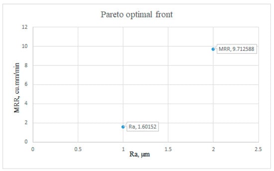 ANOVA was performed using Equations (2) and (3) to obtain objective functions for MRR and SR. Table 4 represents the pareto optimal solutions obtained in a study aimed at achieving superior surface finish and increased material removal rate (MRR). The study was conducted by varying four machining parameters, namely, pulse active (Ton) time, pulse inactive (Toff) time, servo voltage, and peak amplitude of current, using a pareto fraction of 0.1 and a population size of 1000. Table 6 includes 23 solution sets, with the optimal solution being solution number 2. Each solution set was characterized by corresponding values of Ton, Toff, servo voltage, peak current, MRR (in mm3/min), and SR (surface roughness in μm). MRR and SR were the two objective functions obtained after conducting ANOVA. The table shows that the values of Ton, Toff, servo voltage, and peak current varied across the solution sets, leading to different values of MRR and SR. Figure 7 illustrates the 23 results of the pareto optimal front, highlighting a better convergence of the results. Depending on the specific product requirements, any solution from the set in Table 4 can be acceptable. The most desirable set, on the other hand, was chosen with the primary goal of achieving a superior productivity factor and quality factor (MRR and roughness); in this case, solution 2 was preferable to other pareto optimal solution sets.