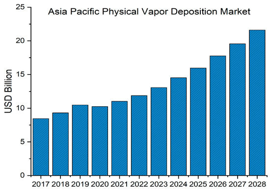 Fortune Business Insights [24] valued the global physical vapor deposition market size at USD 22.43 billion in 2020, with projections indicating reaching USD 40.97 billion at a compound annual growth rate (CAGR) of 8.2% from 2021 to 2028. Figure 2 provides an estimation of the market size in the Asia Pacific region, demonstrating the rising demand for PVD products.