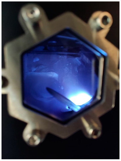 Sputtering is a physical process that involves bombarding a solid target material with energetic ions or atoms, typically using plasma (Figure 4), which causes the target material to eject atoms or molecules from its surface [59]. As a result of the reduced collision probability in a low-pressure environment, the ejected particles travel within the vacuum chamber with an almost straight-line trajectory [60], as confirmed by the good agreement between theoretical studies (mainly based on the Monte Carlo method) and experimental results [61,62]. The line-of-sight trajectory is responsible for the typical columnar microstructure of the deposit [63].