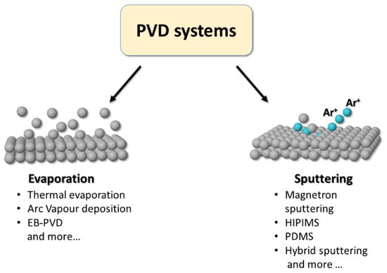 Over the years, the advancement of technologies in the construction of automated production plants has allowed the scale-up of various PVD deposition techniques [54]. In the following sections, the most widely used in industry will be presented and subdivided according to the main physical phenomenon on which they are based: evaporation or sputtering.