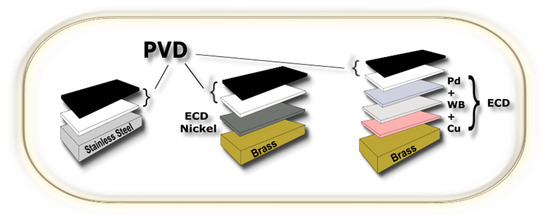 On the other hand, galvanic coatings have lower prices than PVD coatings and can be applied to a wide range of substrates. They offer good adhesion and ductility, making them suitable for applications that require flexibility or deformation. Combining PVD and galvanic deposition can offer unique advantages for decorative coatings. It enables one to obtain a broad color range, improved adhesion, and enhanced wear resistance. The most straightforward hybrid process can be realized using an electroplated surface as the base layer for a PVD-made topcoat that determines the appearance of the finish. This approach provides numerous color and finish options and enhances the durability and wear resistance of the coating. An example of multilayer architectures for brass and stainless steel is shown in Figure 6. On the left side, stainless steel is covered by two PVD layers, the adhesion layer (in white) and the final PVD finish. In the center of the picture, a brass substrate is covered with an electrochemically deposited (ECD) nickel layer; a PVD topcoat is then realized using an intermediate thin film to improve its adhesion (adhesion layer in white). On the right side, a PVD topcoat is realized on a typical nickel-free ECD stack consisting of copper, white bronze (WB), and palladium. Another way to combine PVD and galvanic techniques is through so-called “graded coatings”, where the composition or texture gradually changes during growth, an approach that can improve the erosive, abrasive, and wear properties of the coating. An example of graded coatings realized by varying the current and the voltage bias during deposition was studied by Antonov [83].