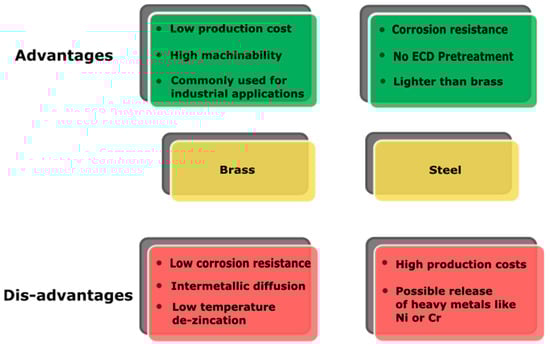 Schematic description of main advantages and disadvantages of brass and steel as substrates.