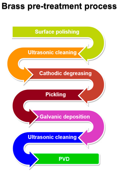 Before electroplating, brass substrates are polished, cleaned, degreased, and the superficial oxides are removed: this preparation is obtained with different steps involving ultrasonic cleaning in an alkaline solution at 60 °C, followed by electrochemical alkaline degreasing and cleaning in diluted sulfuric acid [82]. If Si-based brasses are used, rinsing in hydrofluoric acid between ultrasonic cleaning and degreasing is advisable to improve the adhesion of the deposit. Ultrasonic cleaning is usually performed after electrochemical treatments before entering the vacuum chamber (Figure 9). Some studies of direct PVD on brass for decorative purposes are present in the literature [84,96,97], but as far as the authors know, those procedures are not used in industrial applications.