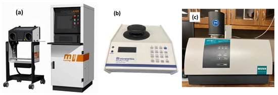 Images showing the experimental setups, (a) laser powder bed fusion 3D printer from Concept-Laser, (b) pycnometer for density measurement, (c) Netzsch LFA 467 thermal diffusivity tester.