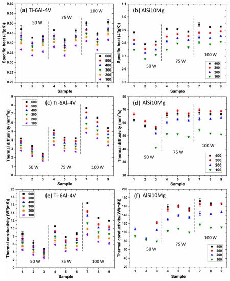 Thermal conductivity was determined as the product of thermal diffusivity, specific heat, and density. The results of these thermophysical property tests for L-PBF Ti-6Al-4V alloy samples and AlSi10Mg alloy samples are displayed in Figure 2.
