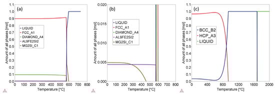 Images showing the amounts of all phases in the alloys as a function of temperature at equilibrium state. (a) Full phase content range for AlSi10Mg; (b) narrow phase content range for AlSi10Mg; (c) full phase content range for Ti-6Al-4V.