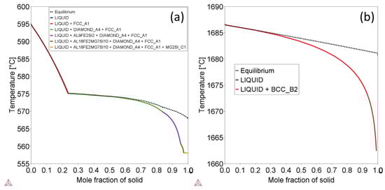 To obtain a better understanding of the effects of cooling rate on the phase structures and individual phase compositions, the Scheil mode of solidification was utilized in Thermo-Calc. This mode assumes that no diffusion occurs in the solid state, while infinite diffusion occurs in the liquid phase [34]. The simulation results for AlSi10Mg and Ti-6Al-4V using the Scheil mode are demonstrated in the Figure 4. When compared to the Figure 3 illustrating solidification under equilibrium conditions, distinct phases emerge under rapid cooling states. Specifically, the Al18Fe2Mg7Si10 phase appears in the AlSi10Mg alloy instead of the Al9Fe2Si2 phase, and only the BCC_B2 phase appears rather than the HCP_A3 + BCC_B2 binary phases present during equilibrium cooling for Ti-6Al-4V alloy. The cooling rate evidently exerts a substantial influence on the phase structures of the alloys. The phase compositions of the alloys were also carefully investigated, with the results listed in Table 4 and shown in the Figure 5. By comparing these results, it is evident that the principal phases of the alloys under equilibrium conditions contain significantly lower quantity of solute atoms. Specifically, for the AlSi10Mg alloy, it contains 100% Al under equilibrium conditions in the FCC_Al phase (Table 4), while it possesses approximately 2 wt.% Mg + Si solute atoms under fast-cooling state (Figure 5). For Ti-6Al-4V, there are only ~6.25 wt.% Al solute atoms in the major HCP_A3 phase under equilibrium states (Table 4), while almost all of the 10 wt.% Al + Si atoms remain in the Ti matrix as a single BCC_B2 phase under fast cooling conditions (Figure 5). Consequently, due to rapid cooling, a higher content of solute atoms is present in L-PBF samples.