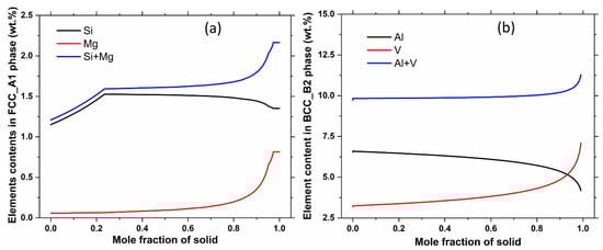 Images indicating the mass contents of solution atoms in the main phases in (a) AlSi10Mg, and (b) Ti-6Al-4V alloys under Scheil model of solidification.