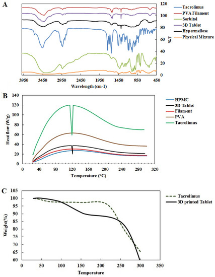 FTIR spectrum of 3D-printed pills (A); DSC thermogram of 3D-printed tacrolimus pills and their ingredients (B); thermogravimetric analysis of tacrolimus monohydrate and 3D-printed tablet (C).