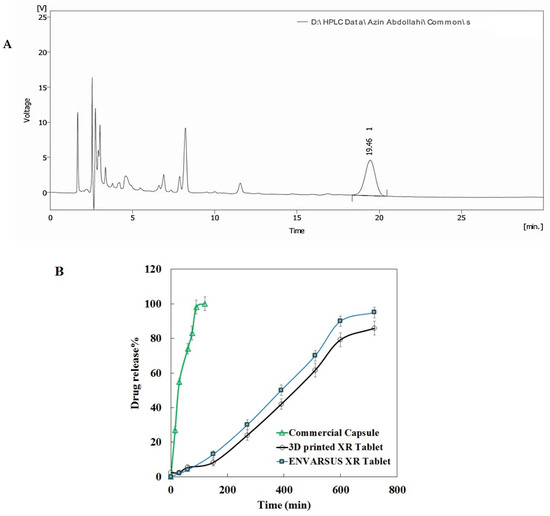 Representative HPLC chromatogram of injected samples of assay solution (A); dissolution profile of 3D-printed tacrolimus of 5 mg in comparison with “ENVARSUS” XR tablet and commercial tacrolimus capsule (B).