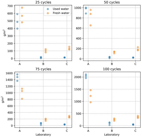 The results were statistically processed after performing 100 freeze–thaw cycles according to the DiCh-A method and after determining the amount of scaled off material from the specimen after every 25 cycles. First, the equality of the means of the results of the tests performed by the three laboratories was tested at the 0.05 significance level. The one-factor analysis of variance (ANOVA) was used. The tests were performed separately for each level of freeze–thaw cycles and the water used in the water storage. Based on the analyses performed, the differences between the test results are statistically significant at each experiment level. Therefore, the results of the tests conducted by the three laboratories are statistically significantly different. This is also illustrated in a graphical representation (see Figure 1).