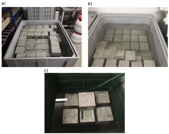 After 24 h from the concrete mixing, the test specimens were de-moulded and placed in different water storage tanks. Sixty-nine specimens were placed in an empty and clean tank that was filled with fresh water from the water supply (Figure 2a). These specimens were used for the main part of the inter-laboratory comparison (hereinafter referred to as “fresh water”). The other 12 test specimens were placed in a tank with previously used water for concrete specimens not intended for this experiment. This water could be considered a saturated solution of calcium hydroxide (Figure 2b), and this storage is referred to as “previously used water”. The remaining 12 specimens were placed in a tank with a constant inflow of water from the water supply (Figure 2c), and this storage is referred to as “slow flowing water”. The water flow rate was adjusted so that saturation with concrete leachates could not occur throughout the maturation process, i.e., for the remaining 27 days. The aim was to maximise the leaching of calcium hydroxide from the test specimens. The differences in water properties in the water storage were also monitored by measuring the pH value: slow flowing water, 6.67; fresh water, 11.44; previously used water, 13.33. The pH measurements were taken with an automatic temperature-compensated probe at 14 days and then 21 days after production. The values are from the second measurement. At 28 days after production, all test specimens were wrapped immediately after removal from water storage in impermeable foil and distributed to the participants of the experiment.