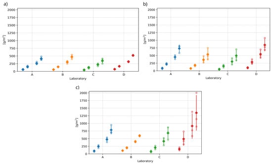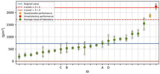 Before the actual assessment of statistical performance using the so-called z-score, it was evaluated whether any of the test results could be considered outliers. For this purpose, the Cochran and Grubbs tests were performed at a significance level of 0.01 [39]. Based on exceeding the critical values of the tests, one laboratory was excluded from the experiment due to outlier results at all experiment levels. Due to the large scale of the ILC evaluation, only the outputs after 100 freeze–thaw cycles are presented below.
