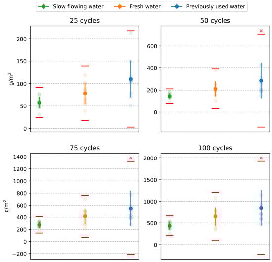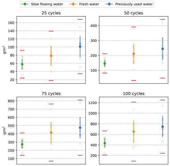 The first step in the statistical analysis of the results of laboratories A to D was to consider whether the differences between the individual test results exhibit statistically significant differences. The aim was to determine whether the results of the tests conducted each time on specimens from the same water storage can be mixed and, thus, be considered as a homogeneous statistical set suitable for further evaluation. At the same time, these tests will demonstrate whether the experimental outputs can be influenced by a higher level of reproducibility (see above). The so-called analysis of variance (ANOVA) was applied, whose null hypothesis is the equality of means of the results between laboratories. Testing was performed at the 0.01 level of significance. The results of the ANOVA tests, presented as p-values in Table 2, indicate no statistically significant differences between the results of the different laboratories. At the same time, the red cross in Figure 6 indicates individual test results that were flagged as outliers by the Grubbs test after mixing the values and were, therefore, excluded from the experiment. A graphical representation of all non-outlying results is shown in Figure 7. The test results of one specimen that showed a significantly higher amount of scaled off material from the specimen after 50, 75, and 100 freeze–thaw cycles were excluded.