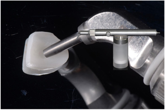 Air-abrasion of porcelain laminate veneer using aluminum oxide particles.