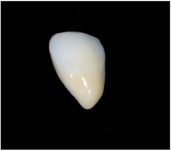 - Chun, Y.H.; Raffelt, C.; Pfeiffer, H.; Bizhang, M.; Saul, G.; Blunck, U.; Roulet, J.F. Restoring strength of incisors with veneers and full ceramic crowns. J. Adhes. Dent. 2010, 12, 45–54. [Google Scholar]