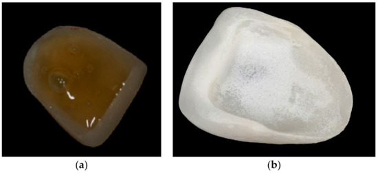 (a,b): Lithium disilicate veneer (a) during and (b) after etching. After etching, precipitates are present on the porcelain laminate veneer surface.