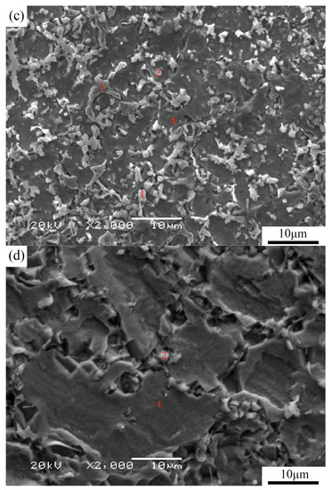 Figure 4 presents a higher magnification cross-section micrograph of the coatings with varying Al contents. In Figure 4a, it is evident that the reinforcing phases of sample S1 were not uniformly distributed within the matrix. However, the addition of Al element improved the distribution of reinforcing phases in the coatings, as illustrated in Figure 4b–d. The coatings exhibited three main types of reinforcing phases. One type was rectangular in shape (point “1” in Figure 4a), another was granular (point “2” in Figure 4b), and the third type was network-shaped (point “3” in Figure 4). Similar typical microstructural features have also been observed in the literature [21].
