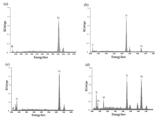 Figure 5 presents the EDS analysis results of these three reinforcing phases. In Figure 5a, the main elements at point “1” were Ti and B, suggesting that the rectangular-shaped particles were TiB2 or TiB. Figure 5b indicates that the granular particles were composed of Ti and C, implying that they were likely TiC. Additionally, Figure 5b reveals that the network-shaped particles were rich in Fe, C, and B elements, indicating the formation of Fex (C,B) compound in the coating. The elements of the matrix (point “4” in Figure 4) in the coatings were also examined, as shown in Figure 5d, and mainly comprised Fe, Al, and Ti. Combined with the XRD analysis results, it can be inferred that the matrix of the coatings consists of intermetallic compounds such as AlxTi and AlxFe.