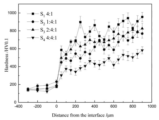 The micro-hardness measurements along the cross-section of the specimens are presented in Figure 6. The micro-hardness of the coatings was significantly higher than that of the substrate, with the maximum micro-hardness of the coating reaching 955.5 ± 50.7 HV0.1 (S1), approximately six times that of the substrates. This increase in hardness can be attributed to the presence of hard reinforcement phases synthesized in situ during the cladding process. From Figure 6, it is evident that the average micro-hardness of sample S1 was the highest, followed by sample S3 (826.1 ± 59.9 HV0.1) and S2 (769.5 ± 51.3 HV0.1), while the hardness of sample S4 was relatively lower (582.5 ± 39.7 HV0.1). The hardness values of these coatings were comparable to the TiC-TiB2-reinforced MMC coatings reported in the literature for TIG cladding and some laser cladding processes [14,19], significantly higher than the hardness of various common steel materials. However, they were lower than Wang’s laser-cladded TiC-TiB2/Fe coatings (approximately 1100–1300 HV), which can be attributed to the inclusion of a considerable amount of Al2O3 as an additional reinforcing phase in Wang’s samples [21].