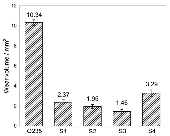 Figure 7 illustrates the wear volume loss of the coatings and the substrate material (Q235 steel). It is evident that the wear loss of all the coatings is significantly lower than that of the Q235 steel. Among the coatings, S3 coating exhibits the best wear resistance, with a wear loss approximately 16.8% that of Q235 steel. This can be attributed to the high hardness of the in situ synthesized hard reinforcement particles within the coatings. These hard particles are capable of withstanding the alternating load during the dry wear test, thereby reducing the contact between the matrix and the grinding ring [34].