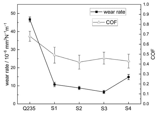 Figure 8 shows the wear rate and COF of the four coatings and the Q235 steel specimens. The wear rates of the coatings are in the range of 10−6 to 10−5 mm3 N−1 m−1. Among these four coated samples, the S3 coating, with a 28.57 wt.% Al addition, exhibited the lowest wear rate of 6.59 ± 0.88 × 10−6 mm3 N−1 m−1, while the S4 coating, with a 44.44 wt.% Al addition, exhibited the highest wear rate of 14.85 ± 1.45 × 10−6 mm3 N−1 m−1. The COF values of the four coatings are in the range of 0.4 ~ 0.5, which are close to the values reported in [21] and lower than that of Q235 steel.